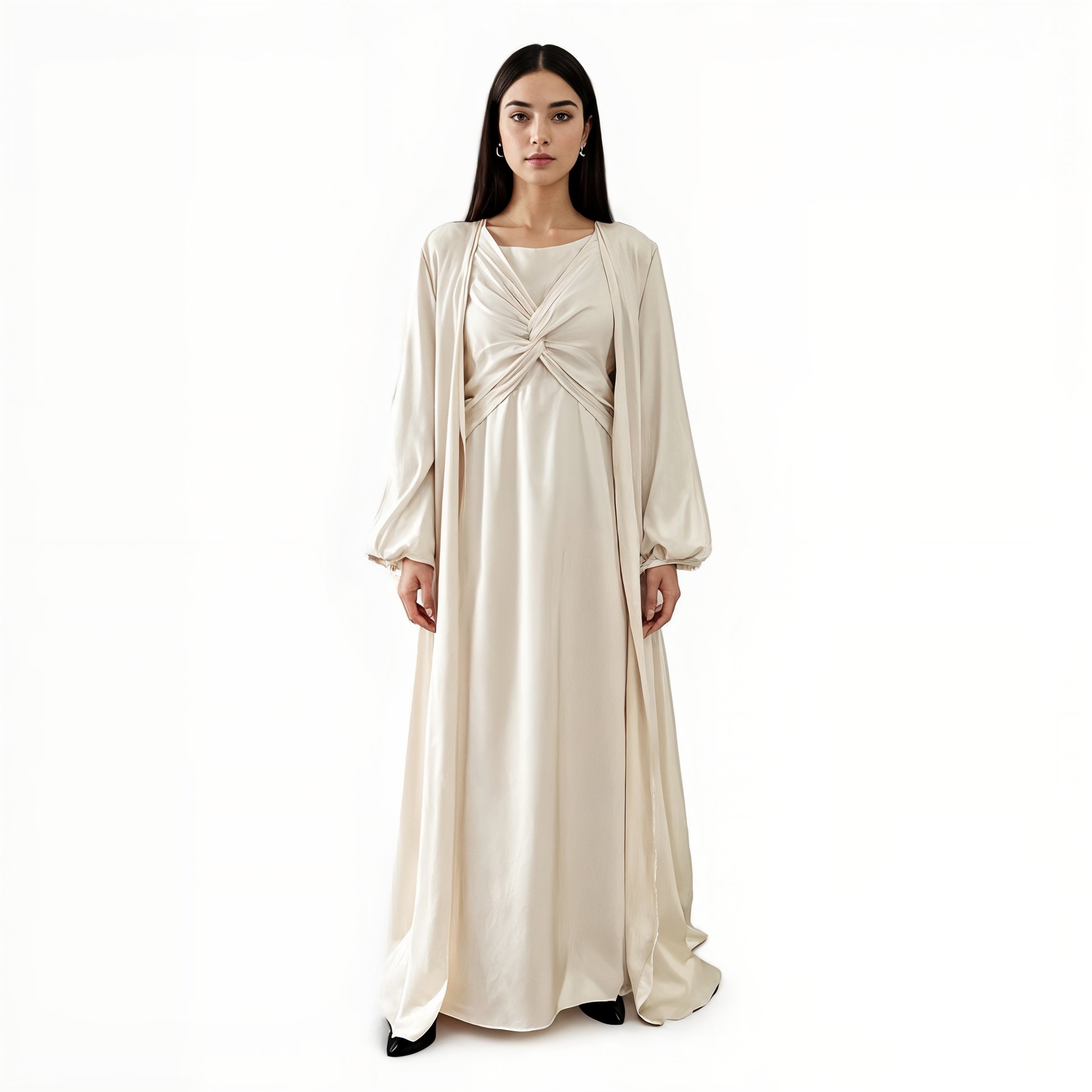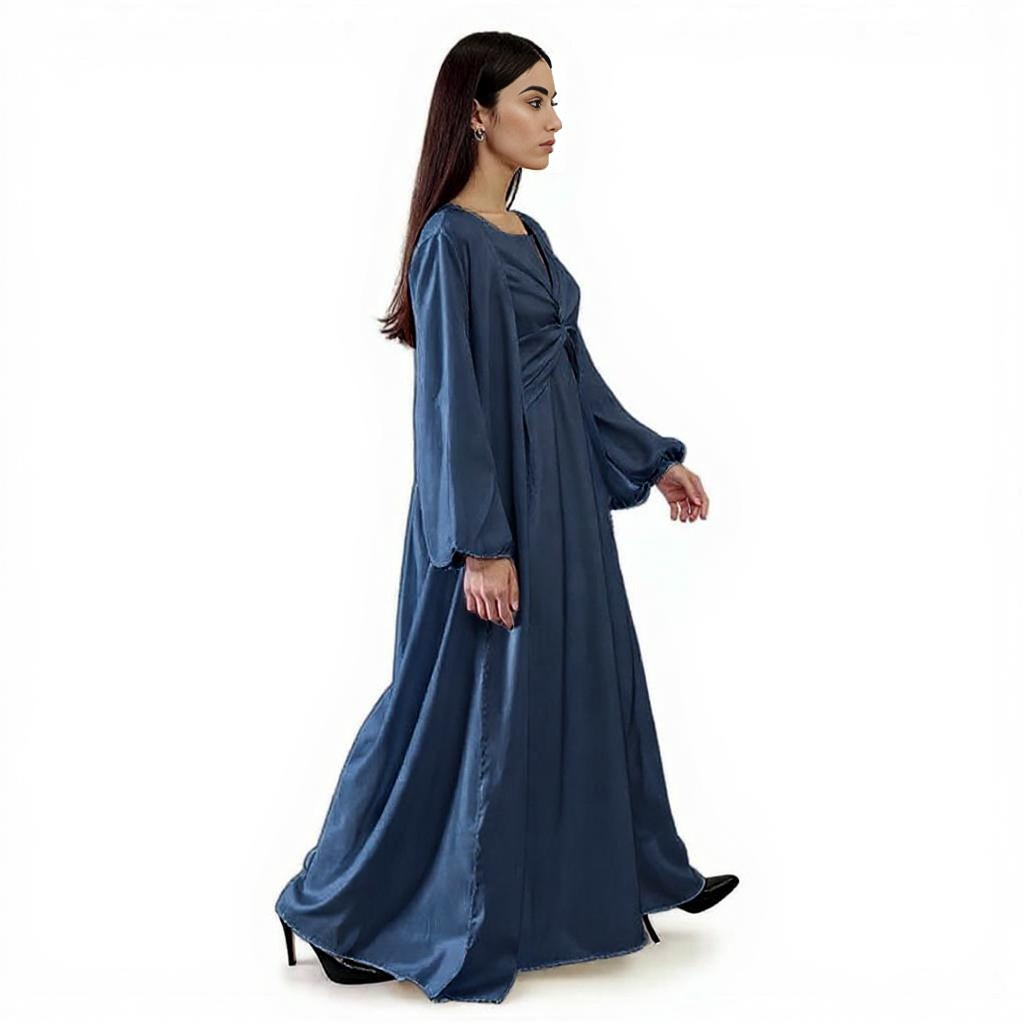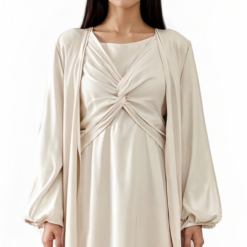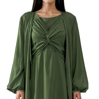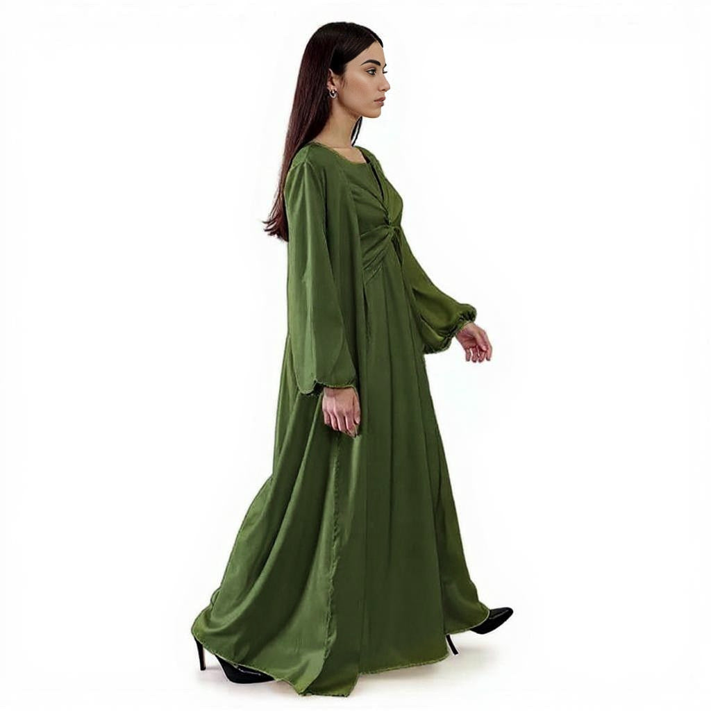 Featuring a modest style with soft pleats and a subtle front knot detail, the flowing fabric drapes effortlessly around the body, offering a comfortable and airy wearing experience.